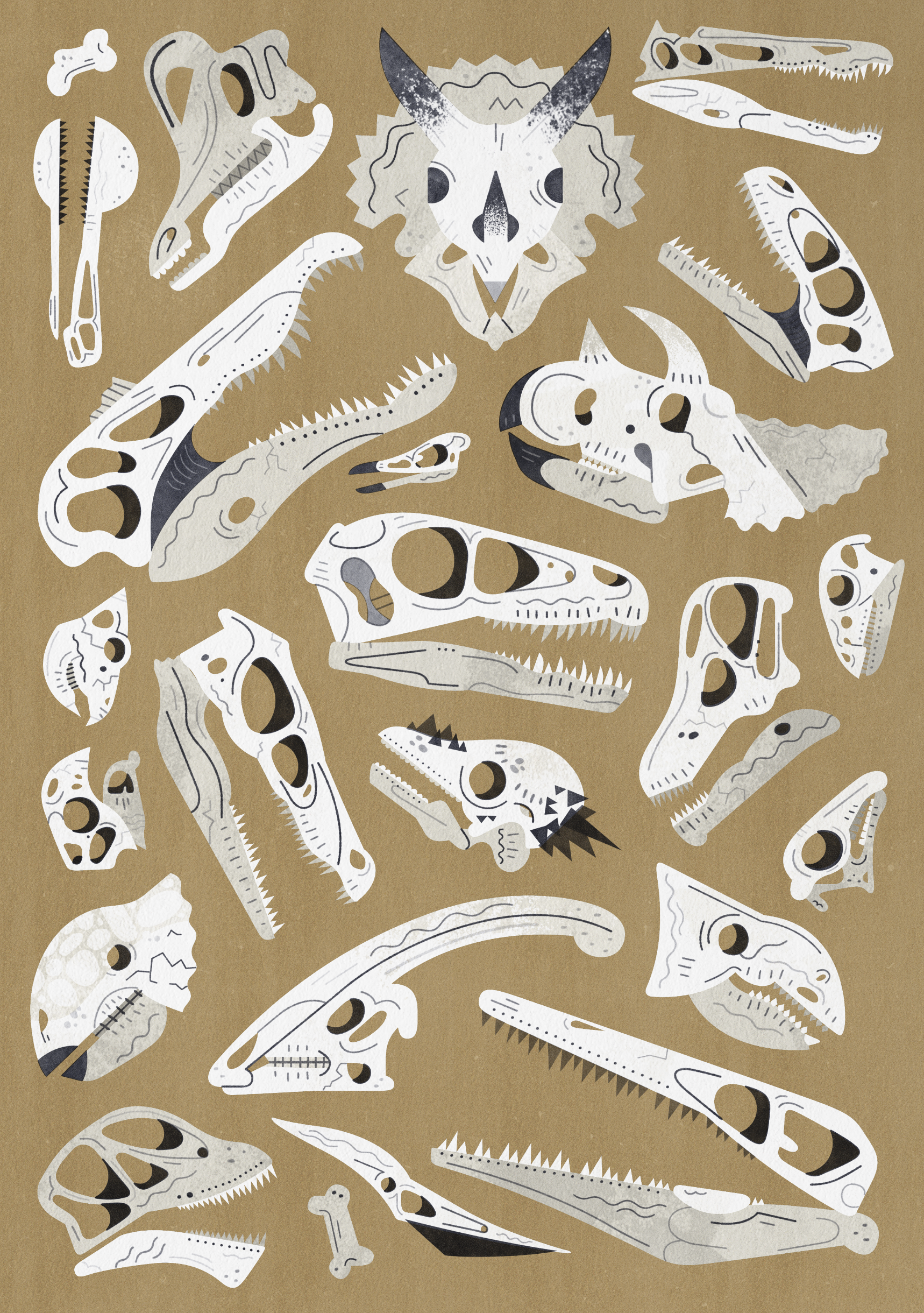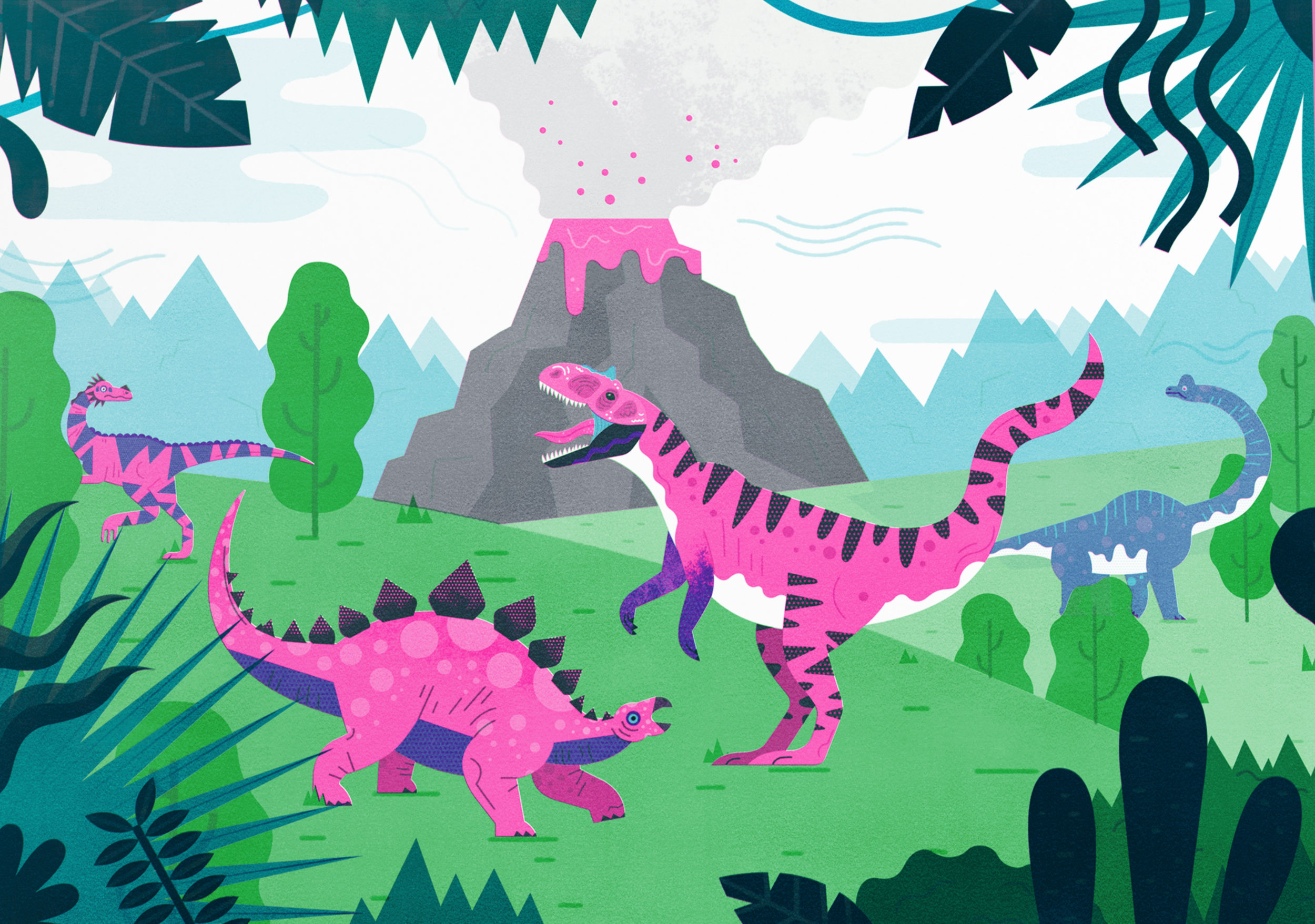 A series of risograph prints based on the mighty dinosaurs through the ages! The illustrations feature cool colours such as florescent pink, neon green and metallic gold. I made these for all budding paleontologists and dinosaur enthusiasts!