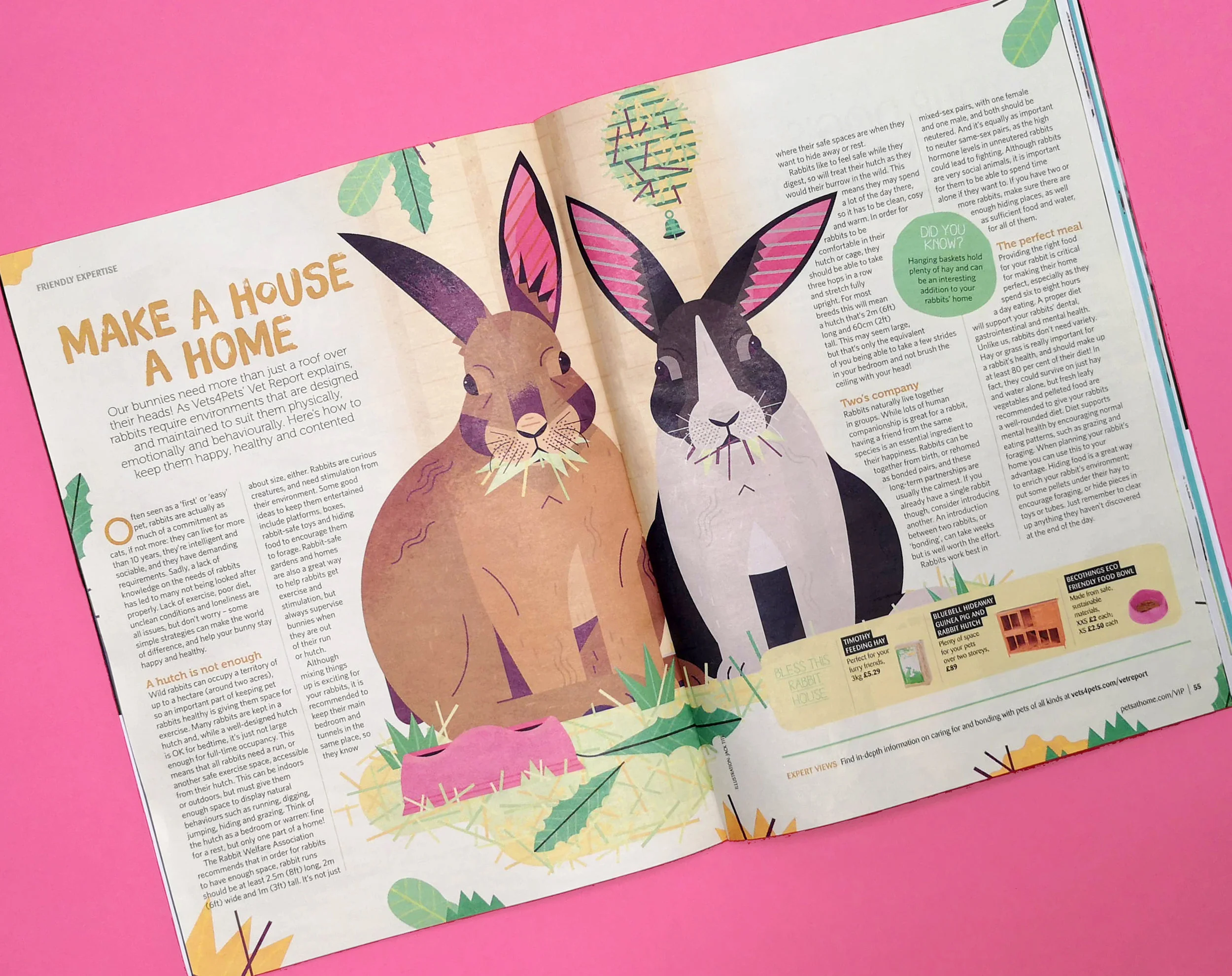 An editorial illustration for Pets at Home’s MyVIP magazine article about how to properly care for rabbits.