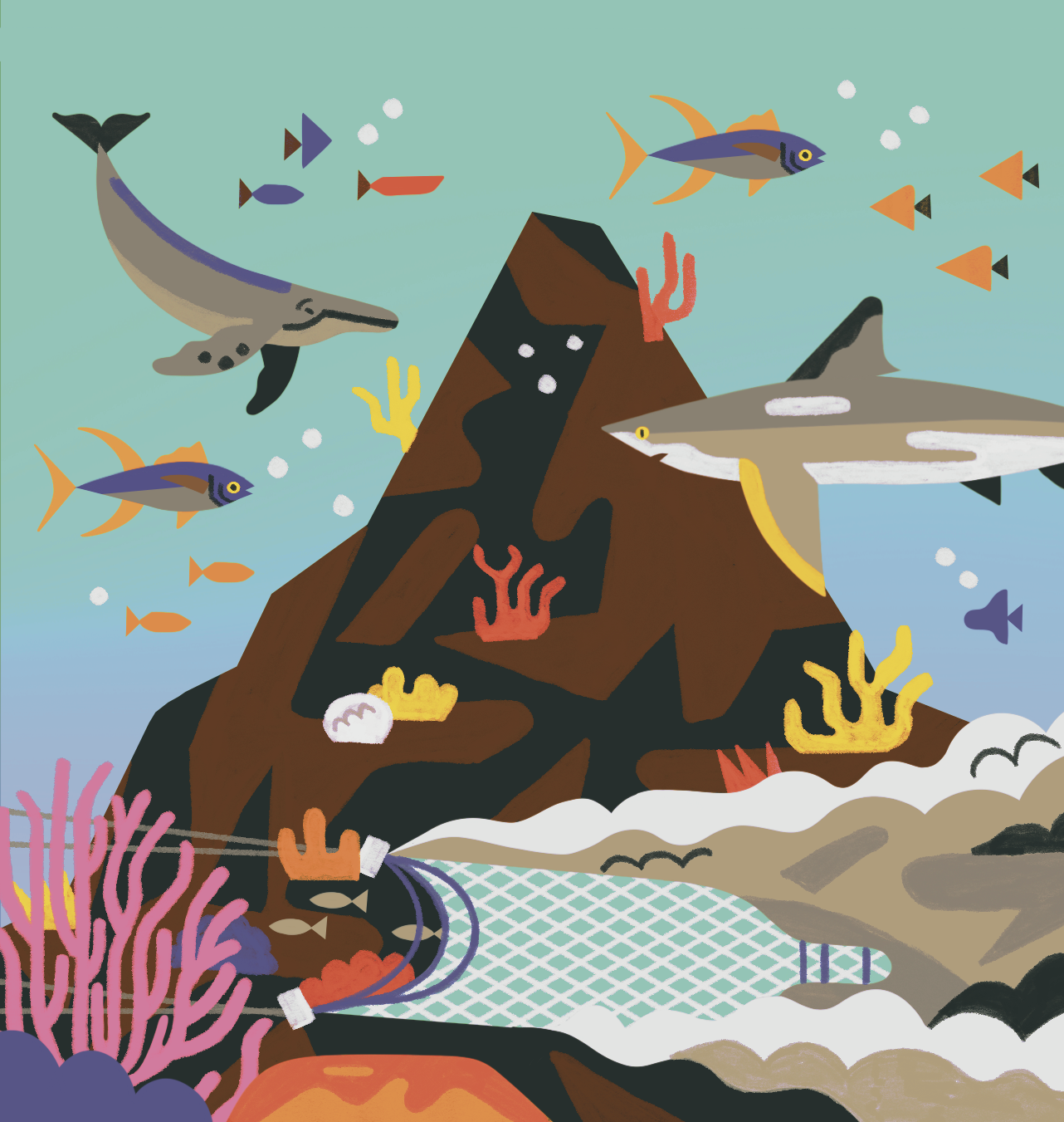 A little illustration for an academic paper called Seamounts: Ecological convergence zones facing growing threats from human activies.
